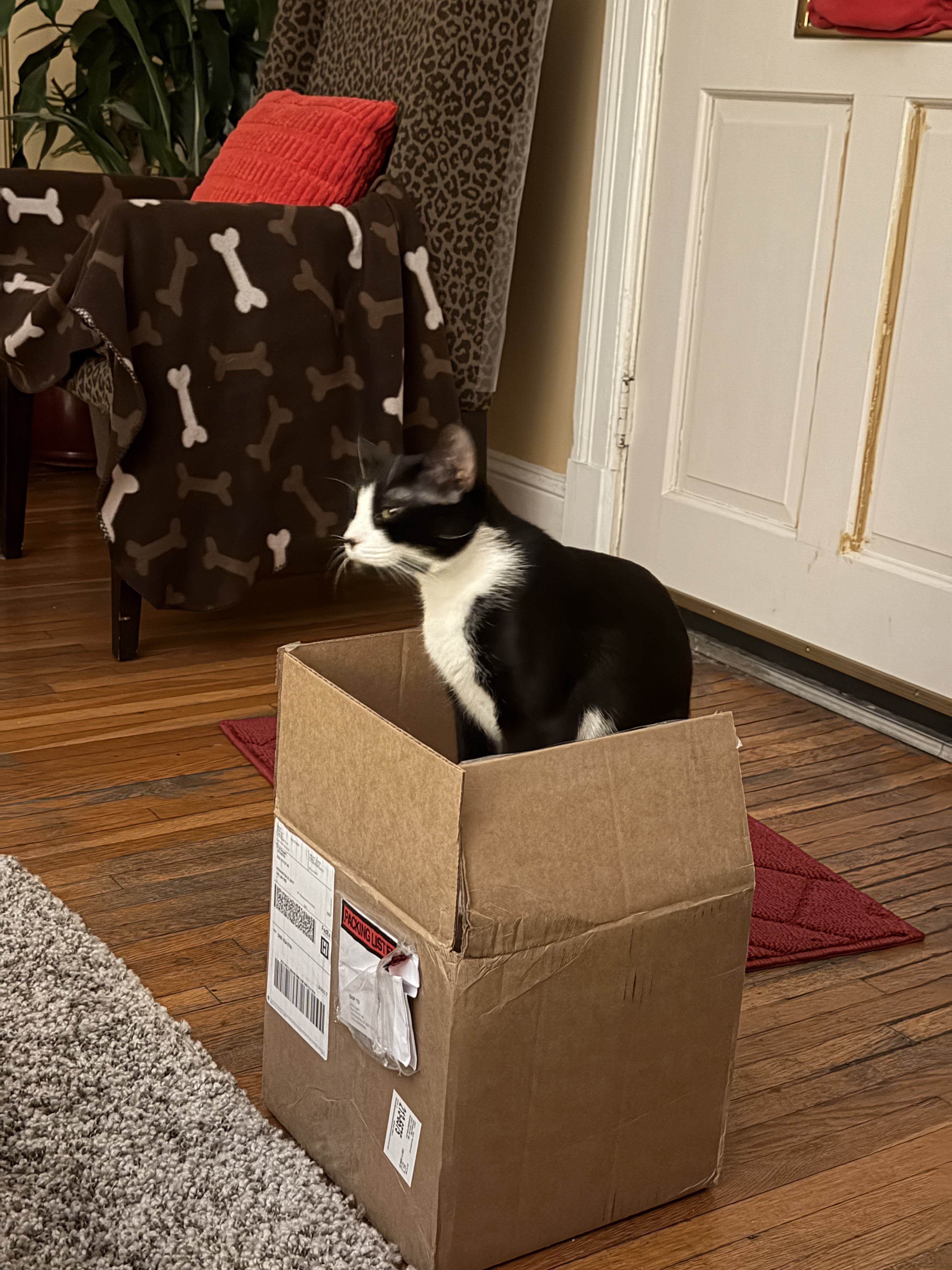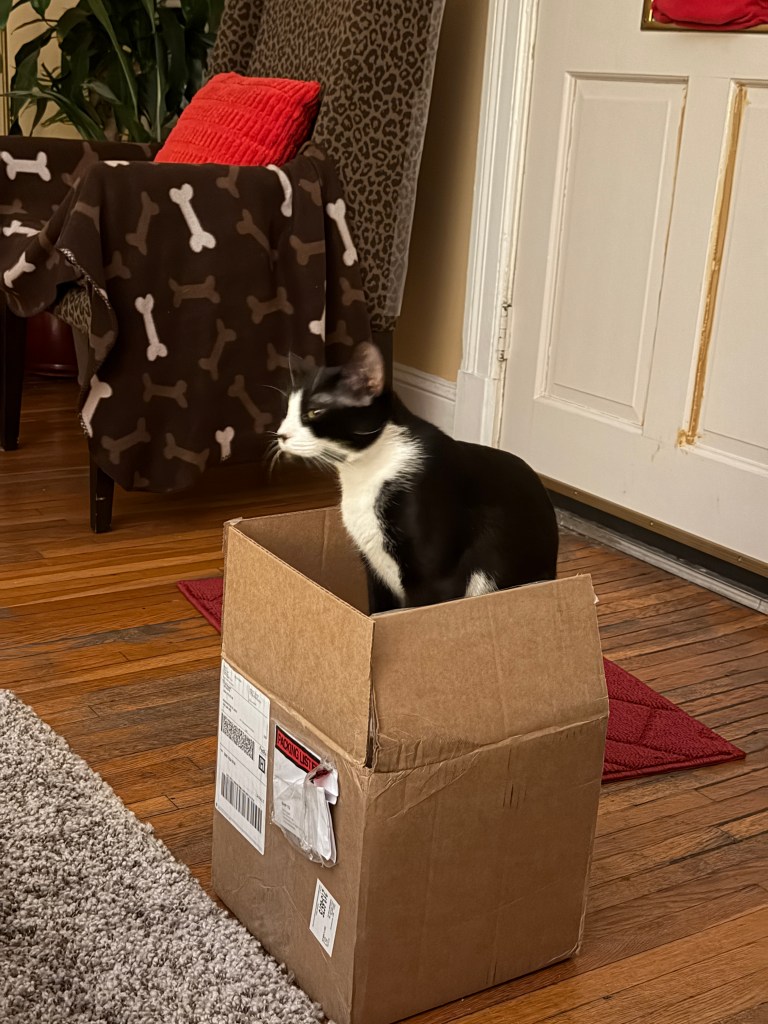 Annie inspecting a package.