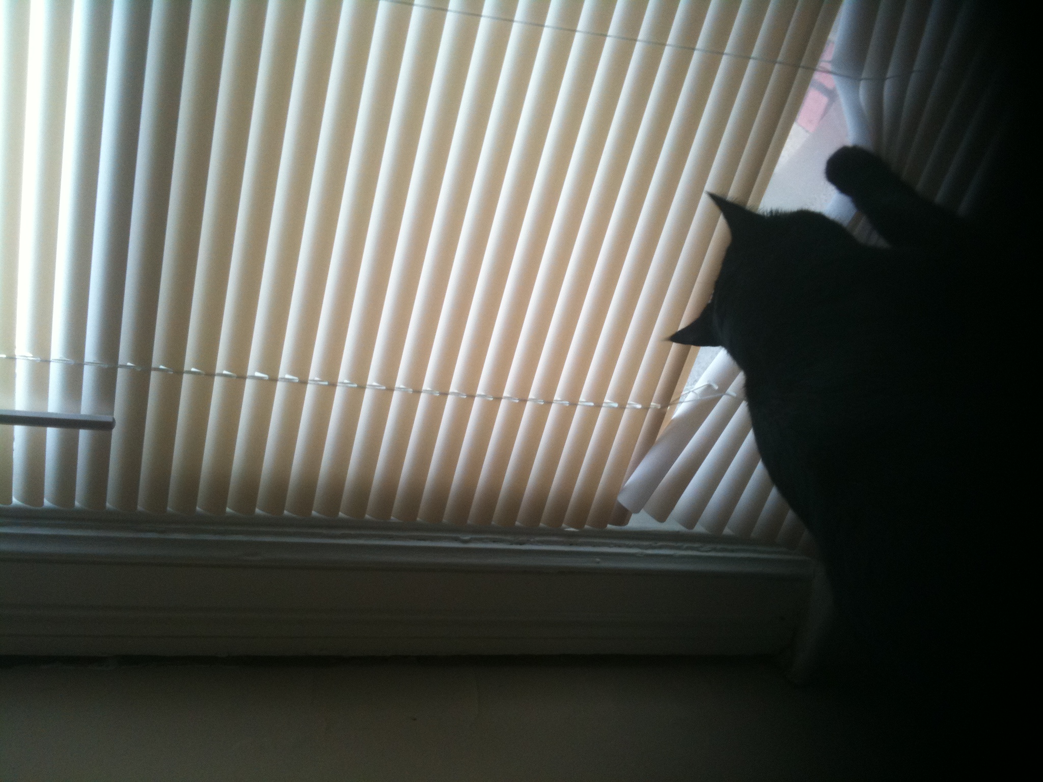 Jean Claude is a peace-loving animal.   He looks out my bedroom window and actually tries to chat with the birds.  Roxie, as those of you who read this blog know, is not so accomodating.    Like most Bombays JC thinks he’s a dog and wants his belly rubbed. Last night he needed extra attention. Ms. Roxie was not  pleased as she feels her need for nighttime attention supersedes his or anyone else’s for that matter.  Eventually the fur began to fly…yes, at 3 am and on my bed!!  Then, détente.  Later Jean Claude made an early  morning request  that the blinds to my bedroom window  be raised — by patting them– to accommodate his need to view his kingdom aka my backyard.  Wednesday is trash day and for whatever reason he seems to find the process of trash collection fascinating.