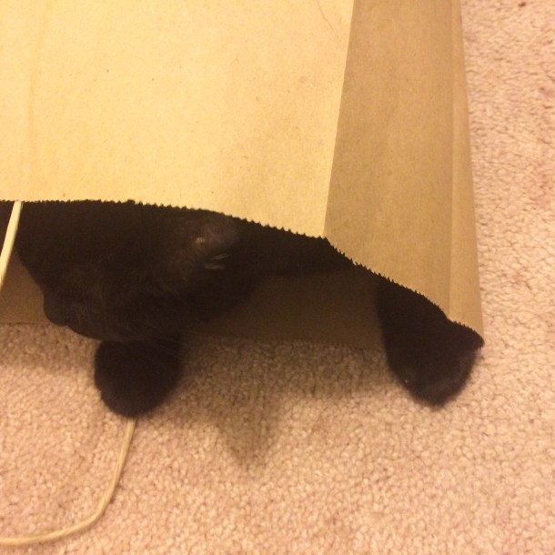 Two weekends ago a small mouse appeared in my kitchen and scurried out of site as I moved in for closer inspection. Needless to say I went to CCL’s house to get Jean Claude and Koko to come and perform exterminating duties at my house. ( Here’s Jean Claude in a T-Maxx bag)