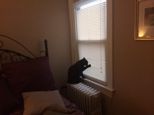 Koko and Jean Claude love the views from the windows of my house in Brookland, D.C. They can be found peering out of windows all over my house, depending on the time of day and their mood. Most mornings, Jean Claude will simply pat on the blinds of my rear view window when he wants me to rise them for his viewing pleasure. Ocassionally we have had some mishaps – blinds have fallen down or Jean Claude has made a few adjustments.