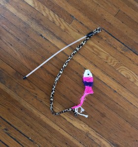 For instance, Grace, the Tabby cat, likes to play with her laser toy but prefers a brightly colored knit fish on a stick. She will allow me to play with her with the device but only for a short time.
